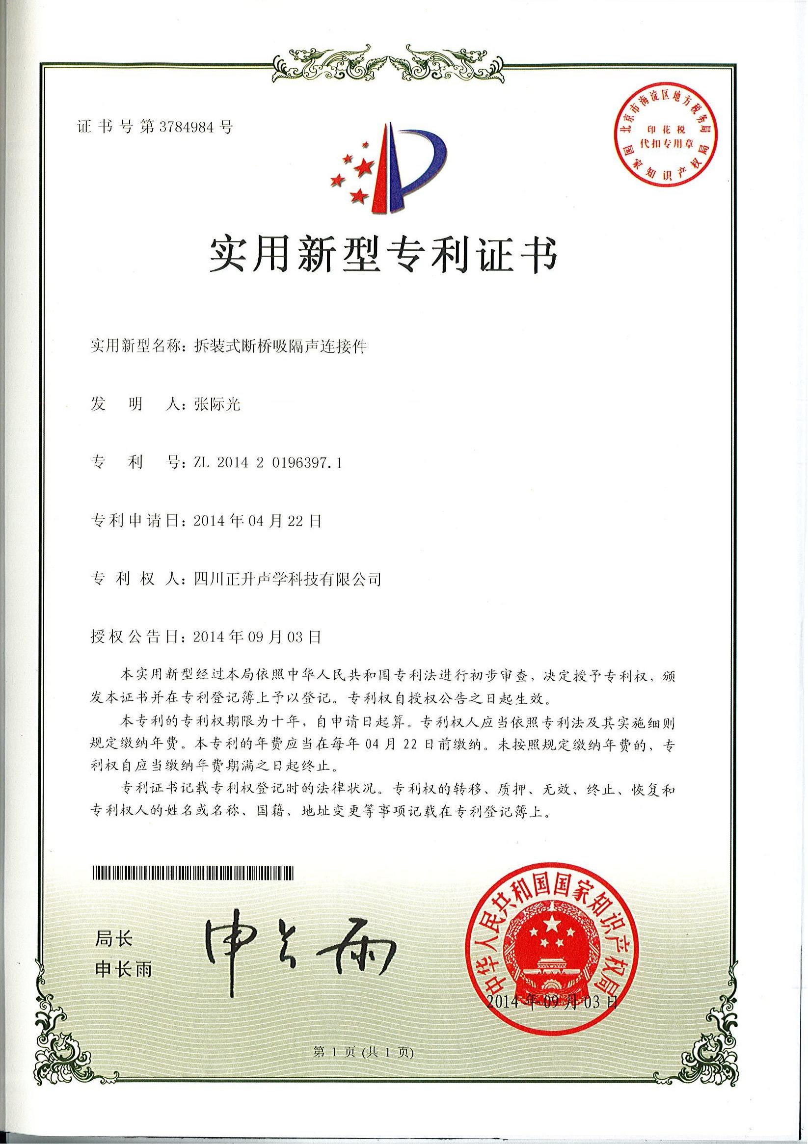 熱烈祝賀公司拆裝式斷橋吸隔聲連接件、分體式斷橋吸隔聲模塊、復合吸隔聲板、可變通道阻性消聲器等實用新型專利授權(quán)且頒發(fā)證書。